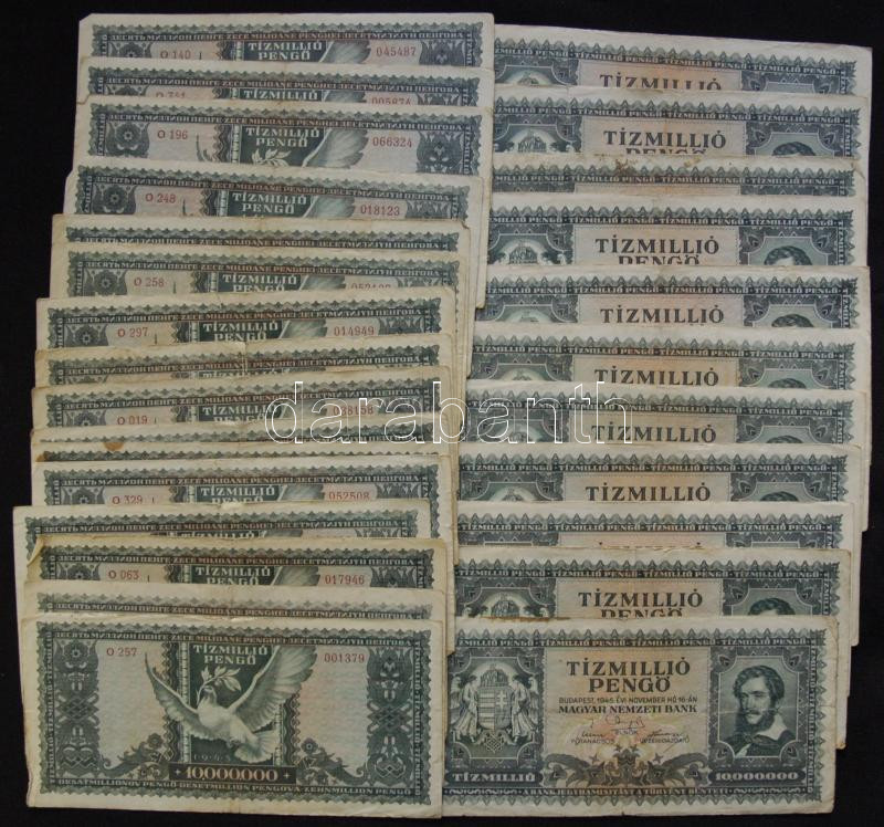 1945. 10.000.000P (30x) eltérő színváltozatok is T:III,III- https://www.darabanth.com/hu/153-Gyorsarveres/153.0/Numizmatika/Magyar-bankjegyek~500128/1945-10000000P-30x-eltero-szinvaltozatok-is-TIII-III-~II475956