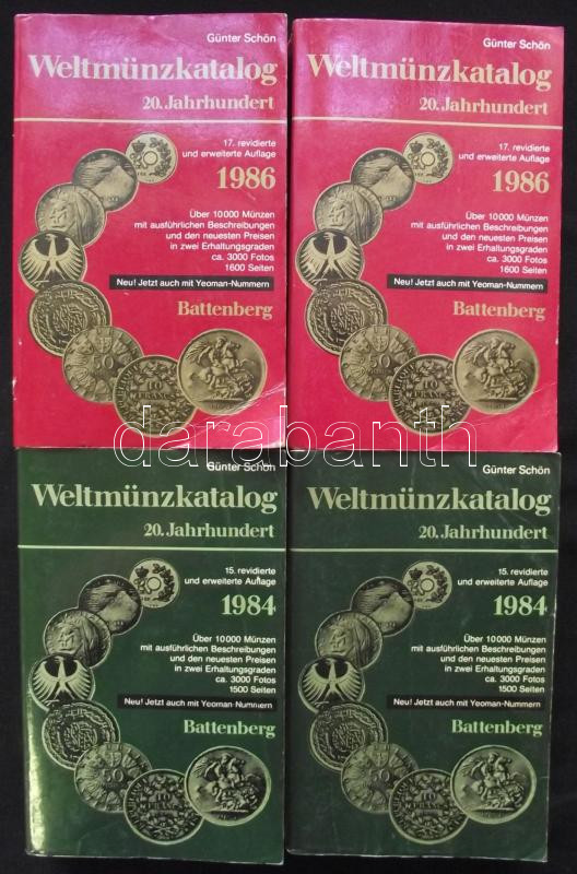 Leírás: Schön: Weltmünzkatalog 20. századi fémpénz katalógus 1984 és 1986 évi kiadások, 2 x 2 kötet