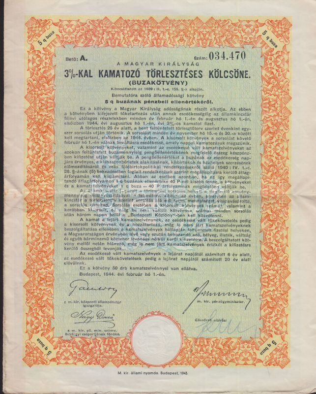 Leírás: 1944. A Magyar Királyság 3%-kal kamatozó törlesztéses kölcsönének 5q / 200P-ős búzakötvénye