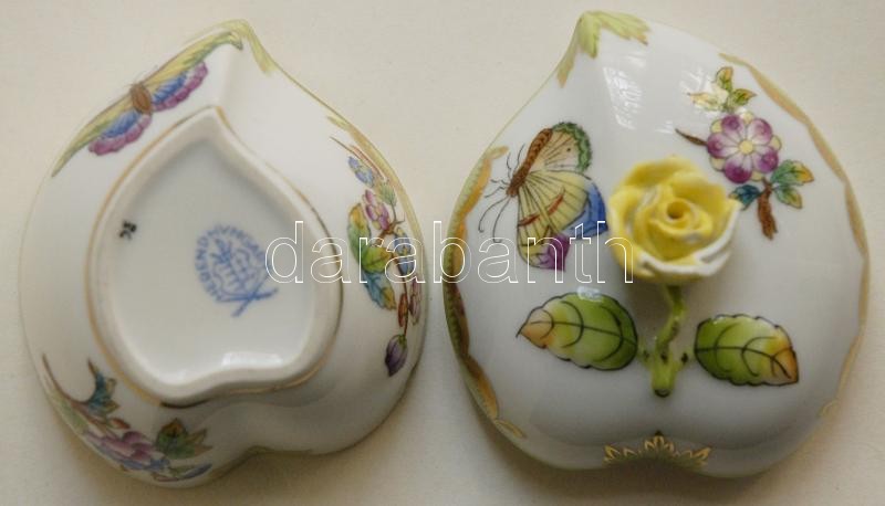 Kézzel festett Viktória-mintás jelzett Herendi porcelán bonbonier apró rózsával (apró lepattanások a virág szirmán) / Handpainted Herendi chinaware bonbonier with small rose (small faults) 8x7x7cm