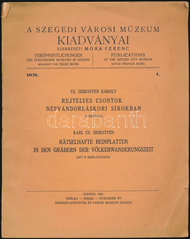 Leírás: Cs.Sebestyén Károly: Rejtélyes csontok a népvándorláskori sírokban. Somogyi-Könytár és Városi Múzeum Szeged, 1931. 47p. papírkötésben