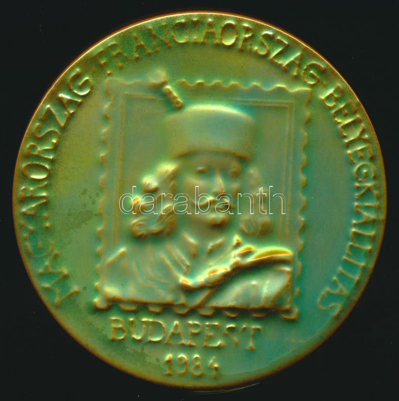 Leírás: "Magyarország-Franciaország Bélyegkiállítás Budapest 1984.", Zsolnay eozin mázas emlékplakett (d=10,5cm)