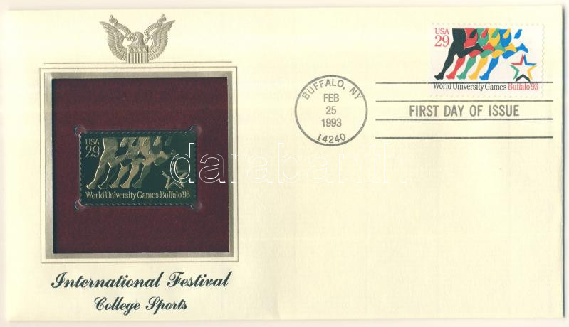 Amerikai Egyesült Államok/Buffalo 1993. "Nemzetközi Fesztivál/Egyetemi sportok" aranyfóliás(22kt) bélyeg replika FDC borítékban, bélyeggel és elsőnapi bélyegzővel és ismertetővel T:1