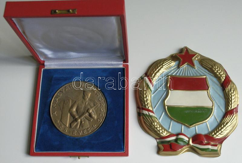 Leírás: "A Magyar Határőrség 25 éves" Br emlékplakett (d=10cm) dísztokban + plasztik Kádár címer