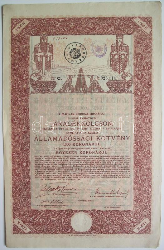 1914. A Magyar Korona Országai 6%-kal kamatozó Járadékkölcsön- államadóssági kötvénye 1000K-ról. "Pesti Hazai Első