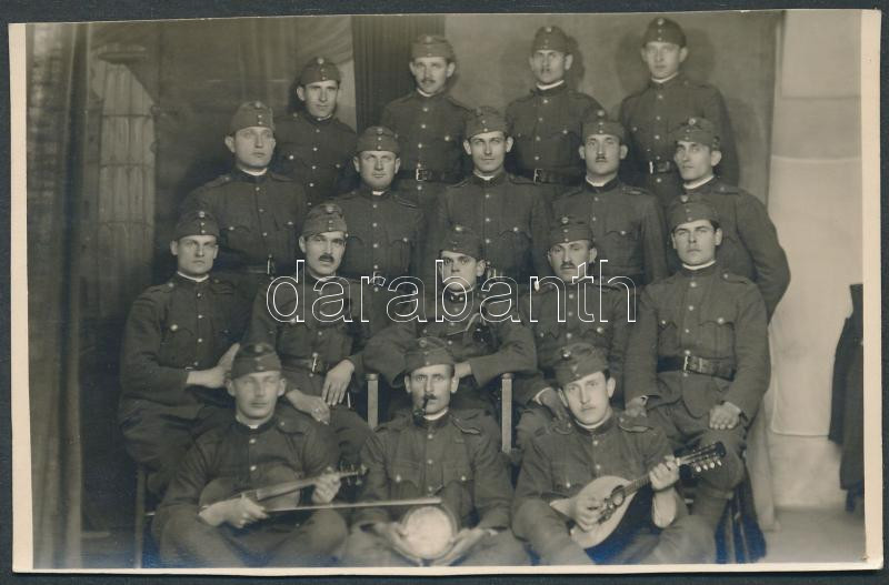 Leírás: cca. 1940 Katonák hangszerekkel- csoportkép 8,5x13 cm