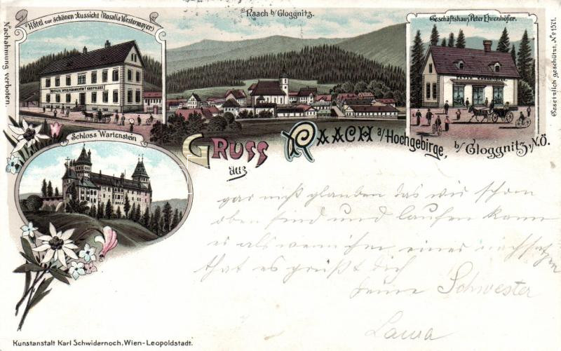 Leírás: 1899 Raach am Hochgebirge, Hotel Westermayer, Peter Ehrenhöfer´s shop litho