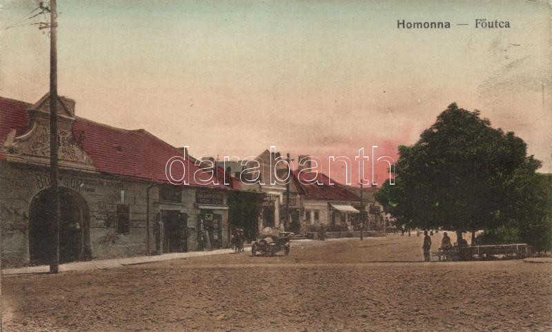 Homonna main street, Hotel Oroszlán https://www.darabanth.com/hu/157-Gyorsarveres/157.0/Kepeslapok/Felvidek~268/Homonna-main-street-Hotel-Oroszlan~II496354