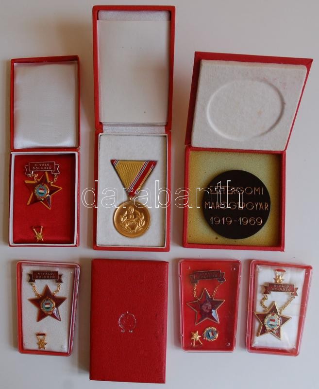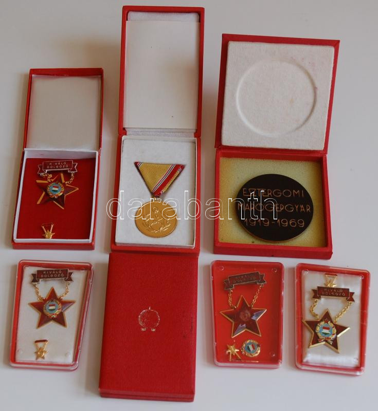 Leírás: 1960-70-es évek 4db "Kiváló Dolgozó" kitüntetés dísz-és plasztiktokban + "Esztergom Marógépgyár 1919-1969" festett fém emlékérem (70cm) dísztokban + "Honvédelmi Érdemérem 10év + 15év" T:1,2,3