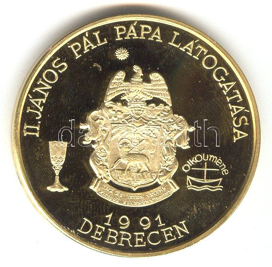 1991. "II.János Pál pápa látogatása - Debrecen" aranyozott emlékérem. ... https://www.darabanth.com/hu/157-Gyorsarveres/157.0/Numizmatika/Magyar-nemesfem-es-fem-emlekveretek-plakettek-kituntetesek~500123/1991-IIJanos-Pal-papa-latogatasa--Debrecen-aranyozott-emlekerem-Szign-BGY-43mm-TPP~II493315