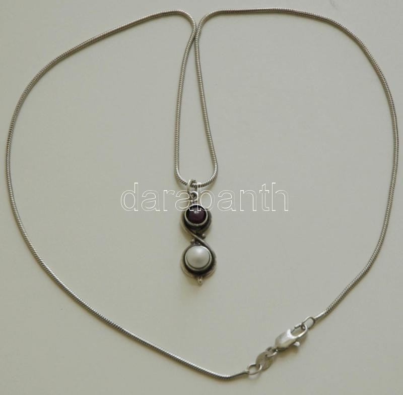 Leírás: Női ezüst (Ag) nyaklánc tenyésztett gyönggyel és rubinnal díszített medállal 6,8gr