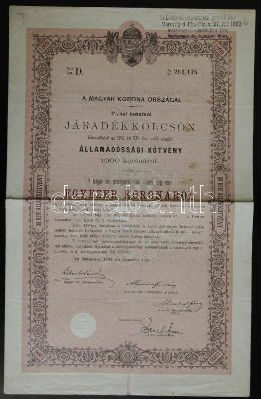 1892. Magyar Korona Országai 4%-kal kamatozó Járadékkölcsön államadóss... https://www.darabanth.com/hu/157-Gyorsarveres/157.0/Numizmatika/Reszvenyek-Ertekpapirok-Sorsjegyek~500119/1892-Magyar-Korona-Orszagai-425-kal-kamatozo-Jaradekkolcson-allamadossagi-kotvenye-1000K-~II485560