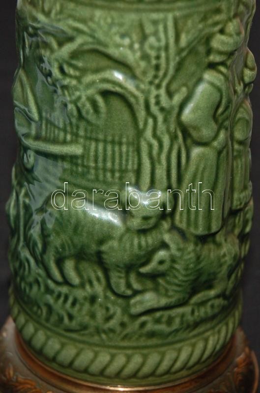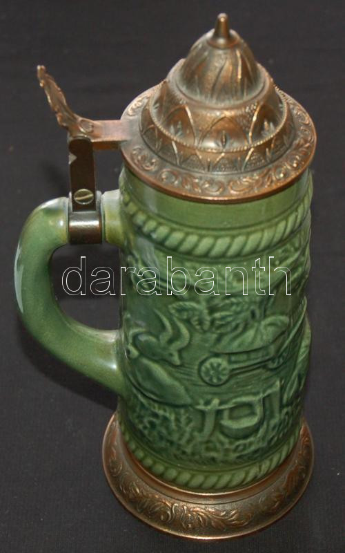 Leírás: Díszes részfedelű és -talpú, mázas domborműves sörös kupa 26cm