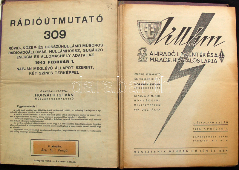 Villám: A híradó leventék és a M.R.A.O.E hivatalos lapja I. évf. (2-14. sz.). Mellette: Rádió útmutató, szerk.: Horváth István, Bp, 1943, 2 térképpel és szakszótárral