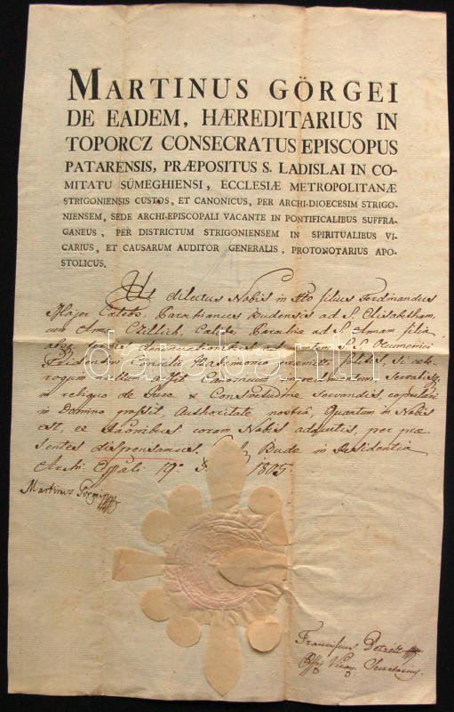 Leírás: 1805 Görgey Márton püspök és Betzelt Ferenc titkár által szignált házasságlevél szárazpecséttel