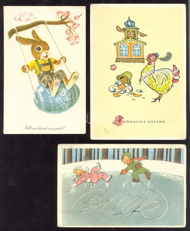 Modern üdvözlő és motívum képeslap tétel, közel 1.000 lap nagyméretű cipős dobozban az 50-es 90-es évekből, magyar és külföldi vegyesen, érdekes színes anyag