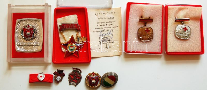 Leírás: 1960-70-es évek "Véradásért" 10 és 15 kitüntetés műanyag tokban + "Szocialista Brigád" kitüntetés tokban + "Kiváló Dolgozó" adományozói irattal tokban + Munka Érdemrend szalagsávja miniatűrrel + 4db sapkajelvény és jelvény T:1,2