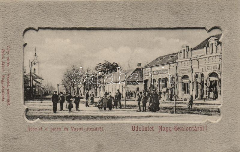 Leírás: Nagyszalonta Piac és Vasút utca, Salamon Ármin, Mogyorós Gergely és Róth Mór kereskedései / market, shops