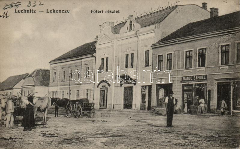 Leírás: Szászlekence, Lekence; Főtér, Mandl Samuel és Emanuel üzletei / main square, shops