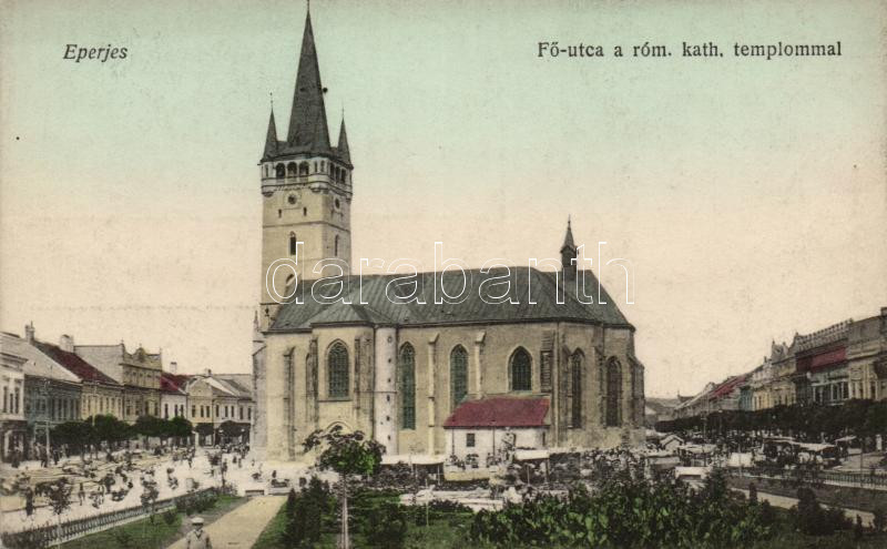 Eperjes main street, catholic church https://www.darabanth.com/hu/16-Nagyaukcio/16.1/Magyar-kepeslapok/Felvidek~4883/Eperjes-main-street-catholic-church~II697262