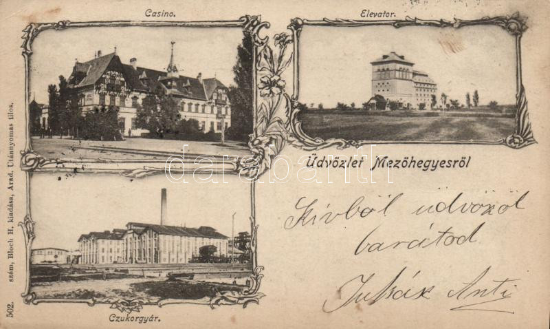 1899 Mezőhegyes kaszinó, elevator, cukorgyár; floral (EK) https://www.darabanth.com/hu/16-Nagyaukcio/16.1/Magyar-kepeslapok/Magyarorszag~4881/1899-Mezohegyes-kaszino-elevator-cukorgyar-floral-EK~II693333