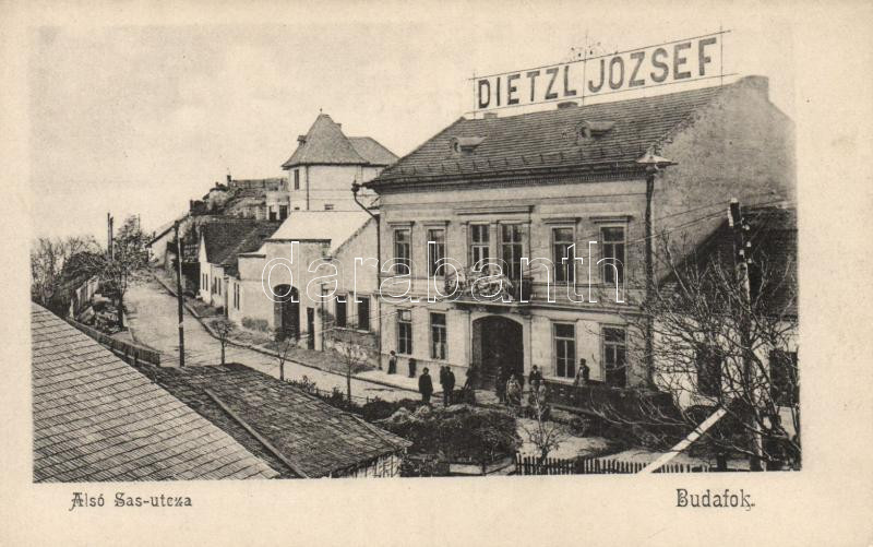 Budapest XXII. Budafok; Alsó Sas utca, Dietzl József kereskedése https://www.darabanth.com/hu/16-Nagyaukcio/16.1/Magyar-kepeslapok/Magyarorszag~4881/Budapest-XXII-Budafok-Also-Sas-utca-Dietzl-Jozsef-kereskedese~II688067