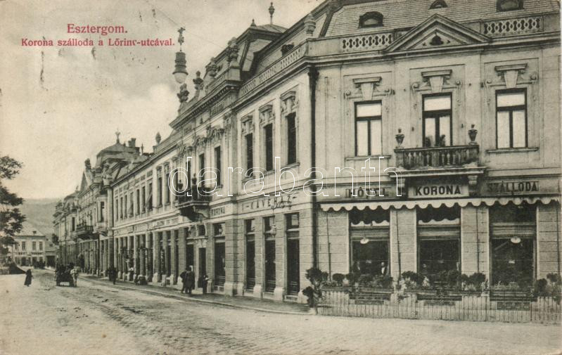 Esztergom Korona szálloda, Lőrinc utca https://www.darabanth.com/hu/16-Nagyaukcio/16.1/Magyar-kepeslapok/Magyarorszag~4881/Esztergom-Korona-szalloda-Lorinc-utca~II695716