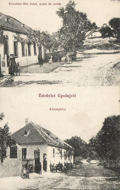 Leírás: Gyulaj, Kirschner-üzlet, posta, óvoda, községháza