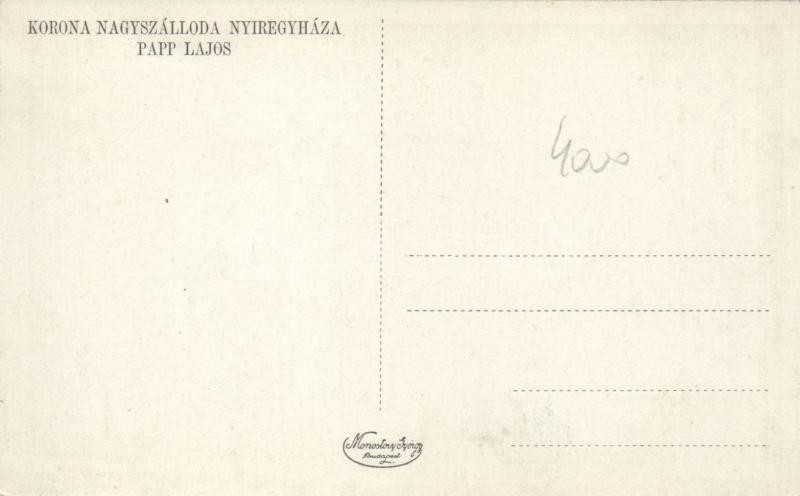 Nyíregyháza Korona Szálloda, étterem https://www.darabanth.com/hu/16-Nagyaukcio/16.1/Magyar-kepeslapok/Magyarorszag~4881/Nyiregyhaza-Korona-Szalloda-etterem~II693240