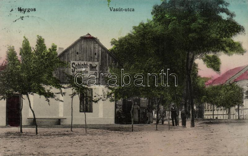 Leírás: Horgos, Vasút utca, vegyeskereskedés / street, shop