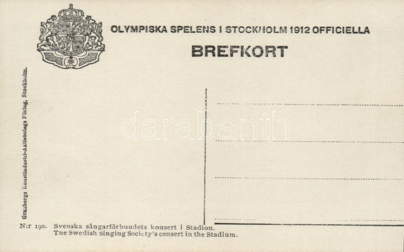 1912 Stockholm, Olympic Games; the Swedish Singing Society's concert https://www.darabanth.com/hu/16-Nagyaukcio/16.1/Motivum-kepeslapok/Olimpia~4962/1912-Stockholm-Olympic-Games-the-Swedish-Singing-Societys-concert~II698364