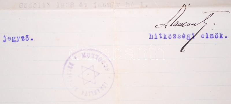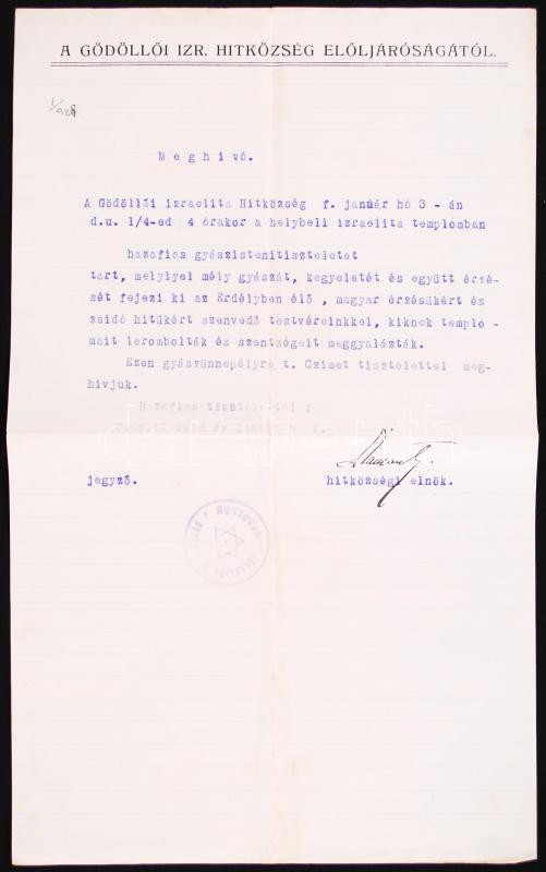 1928 Meghívó a gödöllői izraelita hitközség hazafias gyászistentiszteletére, mellyel "a magyar érzésükért és zsidó hitükért szenvedő" erdélyi testvéreiknek adóznak. Fejléces papíron, hitközségi pecséttel, a hitközségi elnök aláírásával