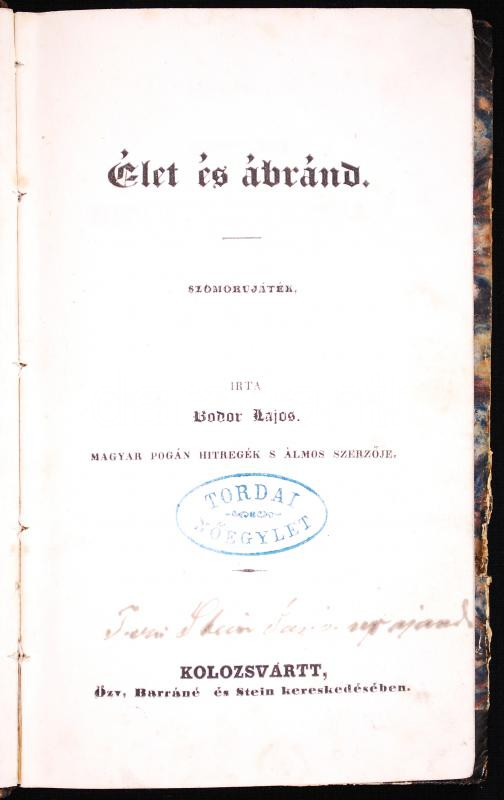 Bodor Lajos: Élet és ábránd. Szomorujáték. Kolozsvártt, 1842, özv. Barráné és Stein. Korabeli, aranyozott gerincű félbőr kötésben, festett lapszélekkel