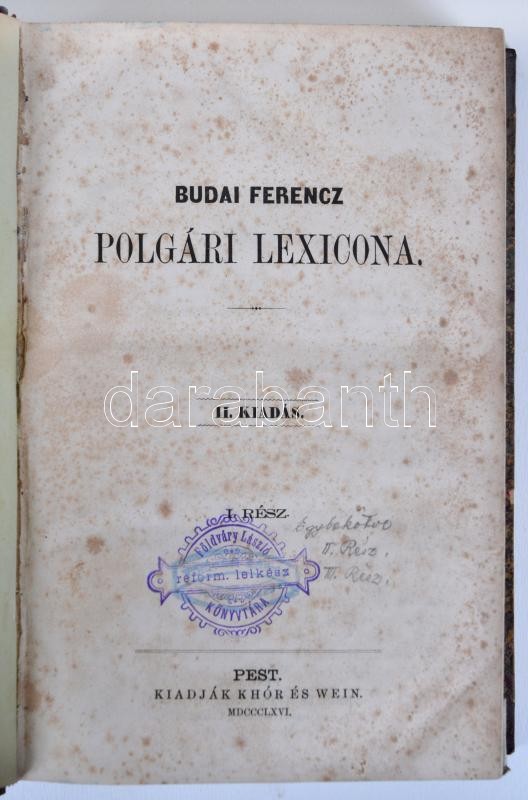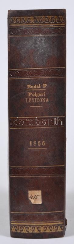Budai Ferencz: -- polgári lexicona I-III. egybekötve Előszó: Réső Ensel Sándor. Pest, 1866. Khór és Wein. 398p. 481p. 456p. II. kiadás. Korabeli, gerincén aranyozott, félbőr kötésben, körben márványozott lapszéllel. Különösen gazdag életrajzi lexikon, több száz nevezetes magyar polgár, nagy idők, nagy emberek, régi erkölcsök, bajnoki tettek rajza.
