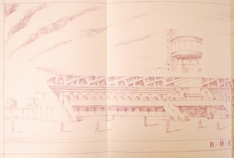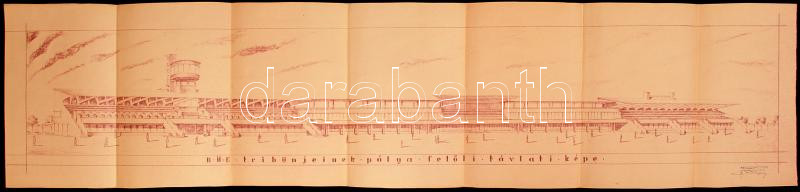 1931 Az 1933-ban megnyitott kerepesi úti ügető (BÜE) a tribünöket pálya felőli perspektívából mutató tervrajza a tervező, ifj. Paulheim Ferenc pecsétjével és eredeti aláírásával /