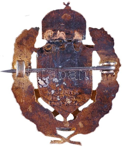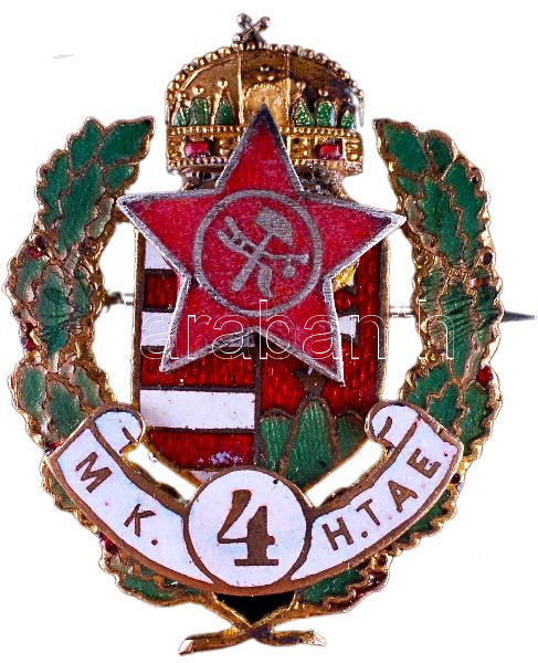 Hungary 1919. "4th Royal Hungarian Honved Artillery Regiment" enamelled cap badge. Sign.: MORZSÁNYI J. / BUDAPEST / ESKÜ-ÚT 5. (35x27mm) with a star shaped enamelled part with plow and hammer which was the early symbol of the Hungarian Soviet republic (system of government), it is a reshaped badge C:XF
