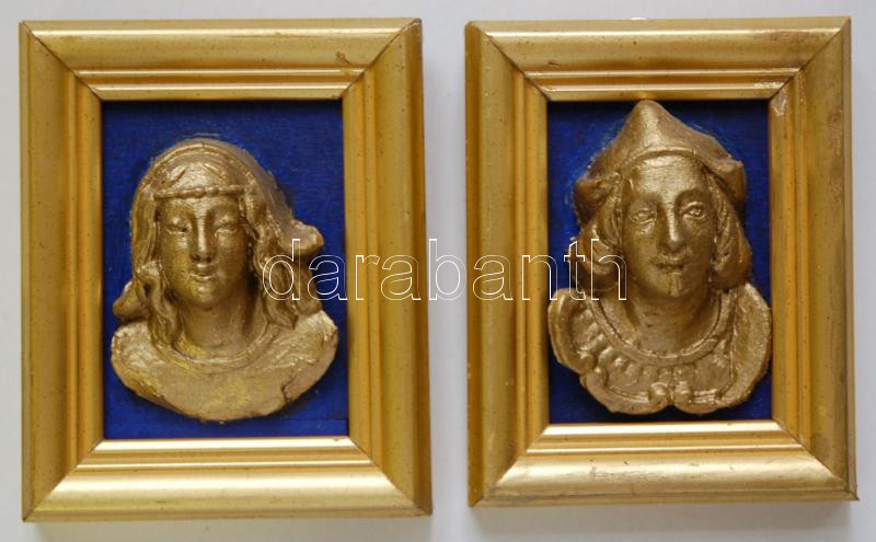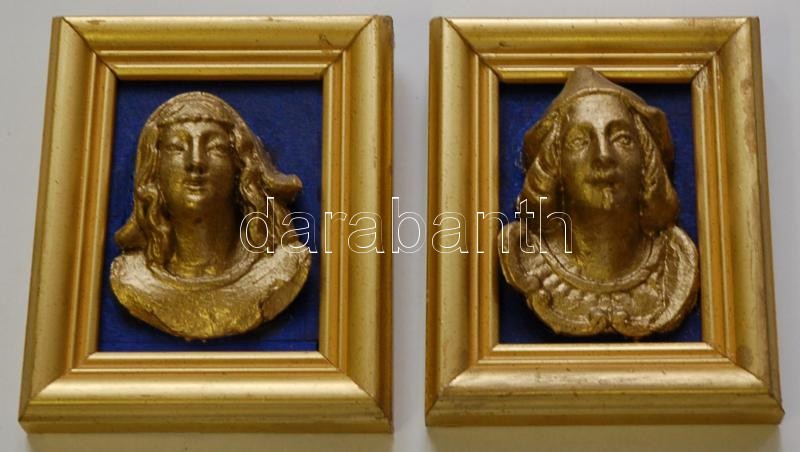 Leírás: Női és férfi aranyozott dombormű 2db fa keretben 11x14cm