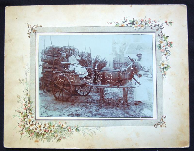 Leírás: GYermekek csacsi-hintóban. Kisvárosi életkép. Keményhátú fotó dekoratív litho kerettel / Photo in litho frame 26x20 cm