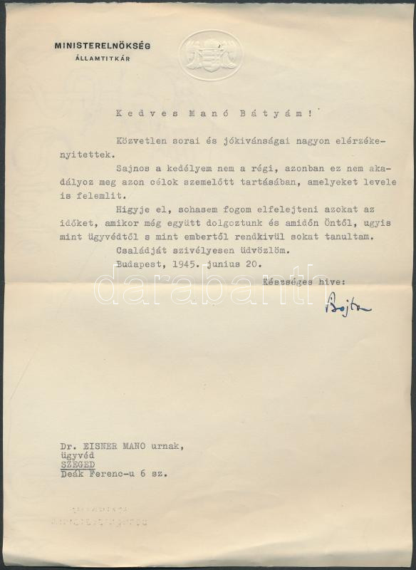 Leírás: 1945 Bojta Béla miniszterelnökségi államtitkár aláírása személyes hangú levélen