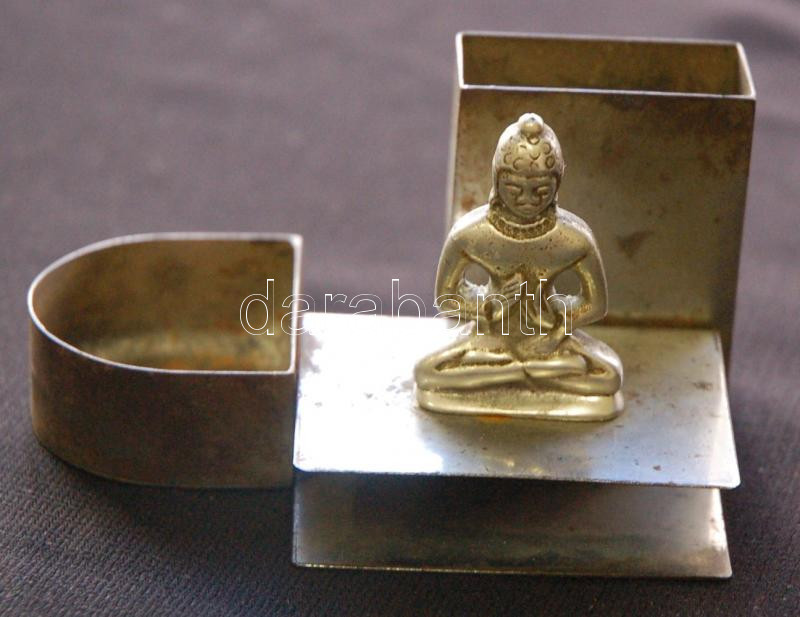 Leírás: Gyufa- és cigaretta tartó fém asztali szett Buddha figura dísszel /