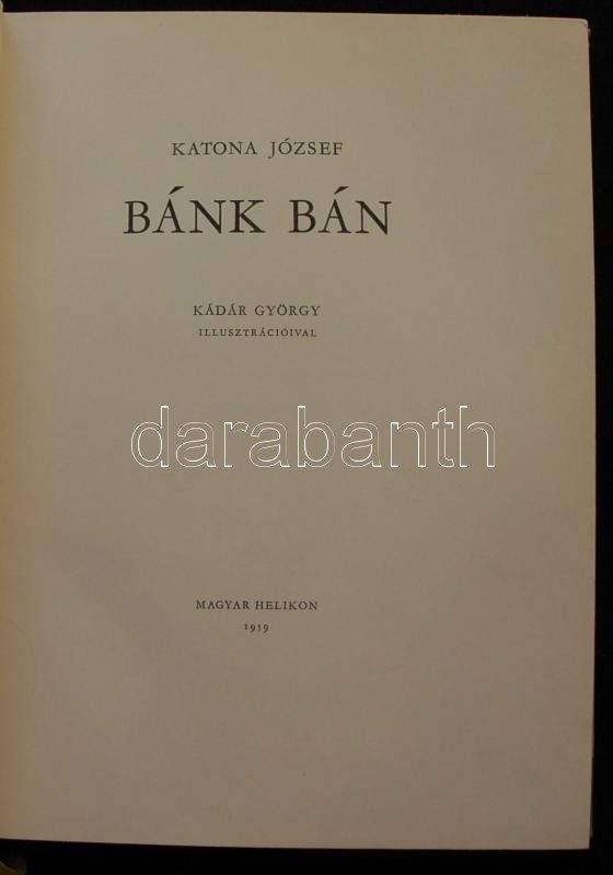 Katona József: Bánk bán, Kádár György illusztrációival. Magyar Helikon... https://www.darabanth.com/hu/161-Gyorsarveres/161.0/Festmeny-mutargy-papirregiseg-egyeb/Konyvek-Egyeb-ritkasagok~500033/Katona-Jozsef-Bank-ban-Kadar-Gyorgy-illusztracioival-Magyar-Helikon-1959~II504766