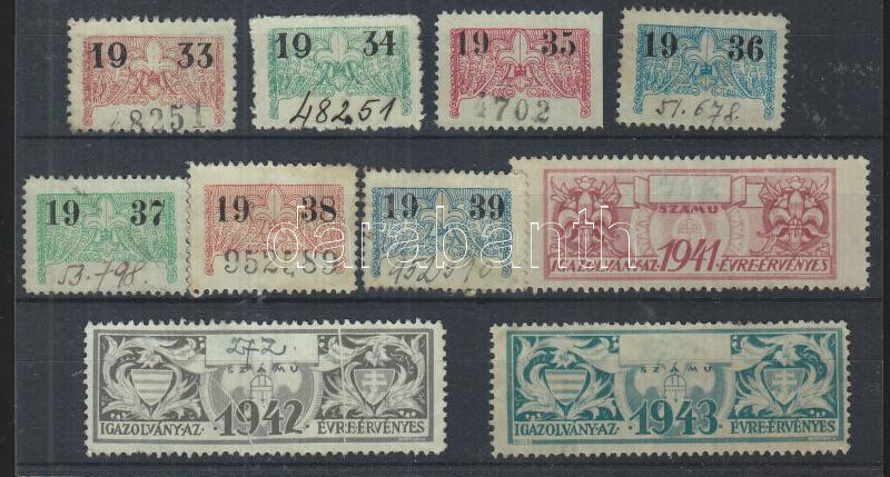 Leírás: 10 db cserkész igazolvány érvényesítő bélyeg 1933-1943
