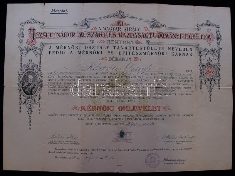 1938 Mérnöki oklevél gr. Teleki Pál saját kezű aláírásával 43x59cm https://www.darabanth.com/hu/161-Gyorsarveres/161.0/Festmeny-mutargy-papirregiseg-egyeb/Tortenelmi-dokumentumok-keziratok-erdekessegek~500005/1938-Mernoki-oklevel-gr-Teleki-Pal-sajat-kezu-alairasaval-43x59cm~II517350