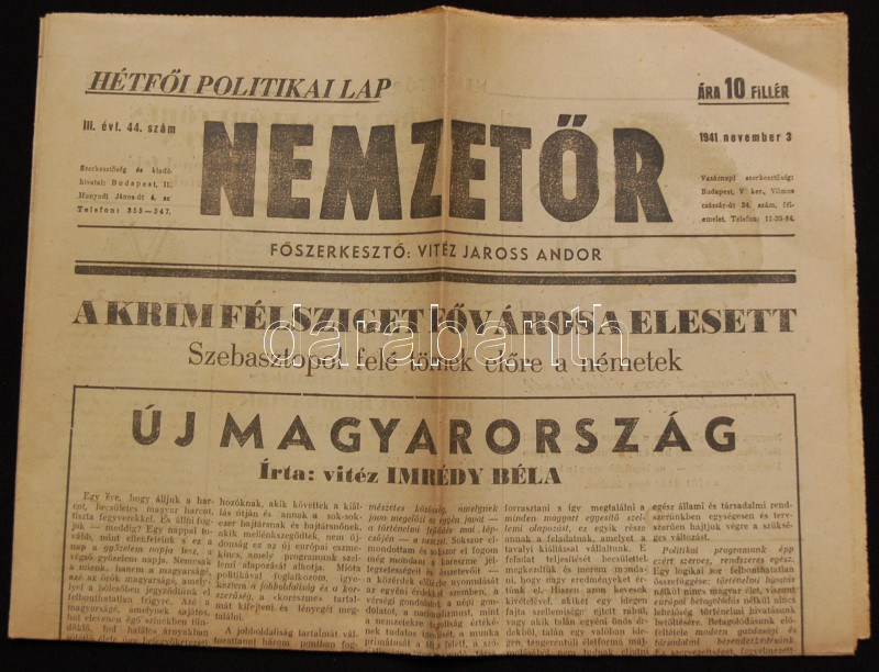 Leírás: 1941 A Nemzetőr c. újság nov. 3.-i száma Imrédy Béla miniszterelnök vezércikkével és a háború híreivel