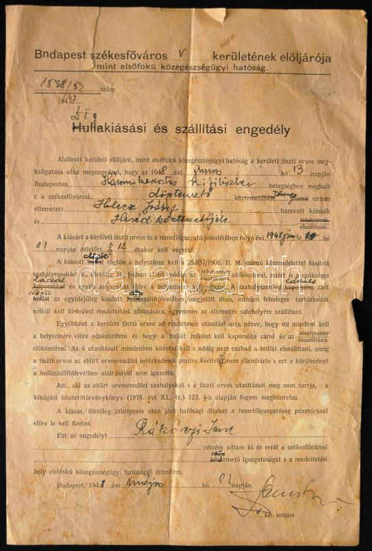 1948 Hullakiásási és -szállítási engedély háromkeresztes szifiliszben ... https://www.darabanth.com/hu/161-Gyorsarveres/161.0/Festmeny-mutargy-papirregiseg-egyeb/Tortenelmi-dokumentumok-keziratok-erdekessegek~500005/1948-Hullakiasasi-es-szallitasi-engedely-haromkeresztes-szifiliszben-elhunyt-budapesti-dog~II520397