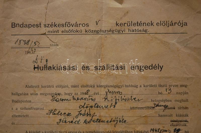 Leírás: 1948 Hullakiásási és -szállítási engedély háromkeresztes szifiliszben elhunyt budapesti dögtemető tömegsírjába hantolt férfi újratemetéséről