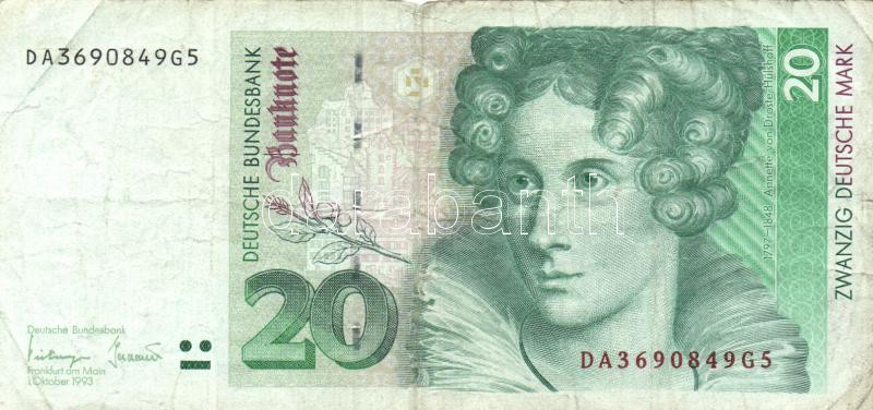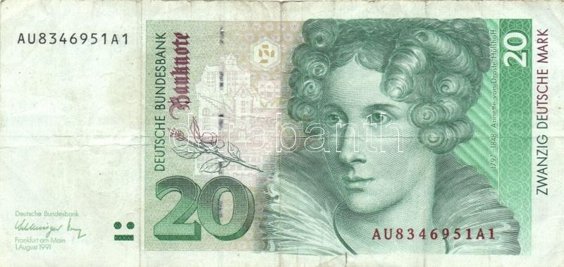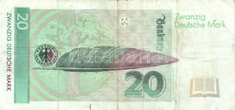Germany 1991-1993. 20 Mark (2x) ... https://www.darabanth.com/hu/161-Gyorsarveres/161.0/Numizmatika/Kulfoldi-bankjegyek~500154/Nemetorszag-1991-1993-20M-2x-TIII-3Cbr3EGermany-1991-1993-20-Mark-2x-CF~II521620