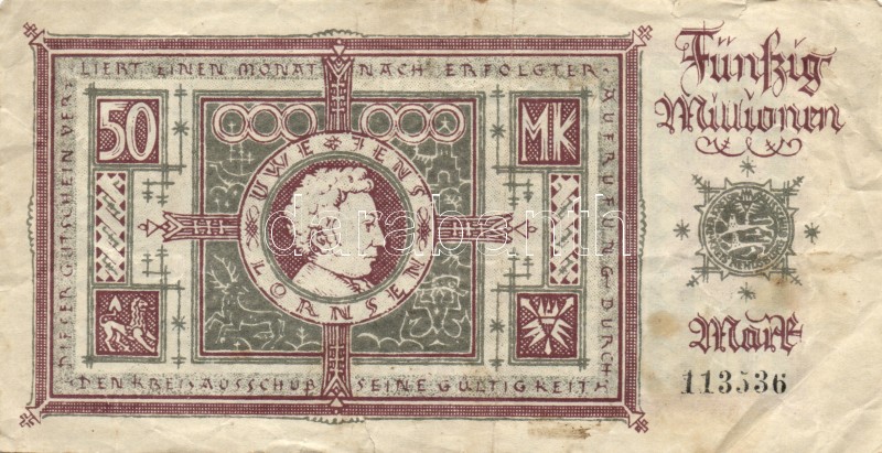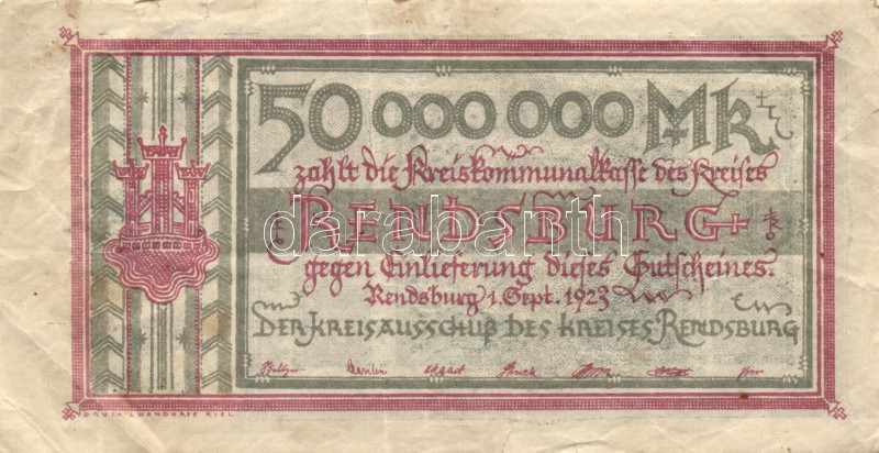 Leírás: Német Birodalom/Weimari Köztársaság/Rendsburg 1923.2.25. 10.000M "Eine Million" felülbélyegzés + 1923.9.1. 50.000.000M T:III