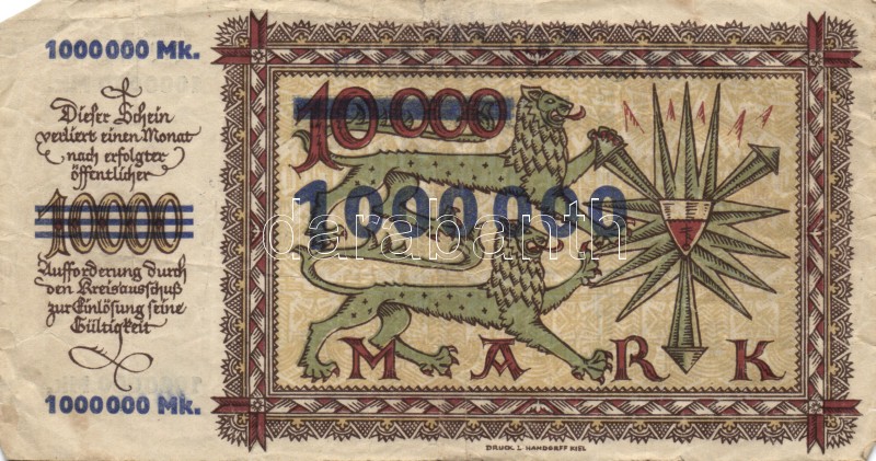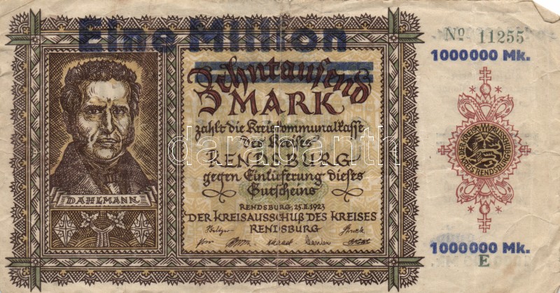 Német Birodalom/Weimari Köztársaság/Rendsburg 1923.2.25. 10.000M "Eine... https://www.darabanth.com/hu/161-Gyorsarveres/161.0/Numizmatika/Papir-es-fem-szuksegpenzek~500141/Nemet-BirodalomWeimari-KoztarsasagRendsburg-1923225-10000M-Eine-Million-felulbelyegze~II519153