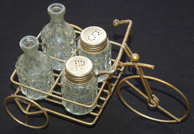 Leírás: 4 darabos sószóró szett réz tricikli alakú tartóban 22x13x14cm